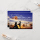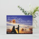 Bröllopsinbjudan i silhuett med solnedgångsparet har en vacker solnedgång med strand, moln och ett mycket lyckligt brudpar. Dessa underrättelser är perfekta för de flesta bröllop. Lägg bara till din egen formulering i mallen. Brudparets namn finns på baksidan av inbjudan.