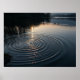 Denna fredliga och evokativa bild fångar ett vackert ögonblick av ett tyst sjö i skymningen. De sista guldstrålarna i sol skapar en ljusskygg väg över vatten, som avbryts av en rad koncentriska upplopp. Krusarna, som kanske orsakas av en utfälld sten eller ett milt stänk, förvränger på ett vackert sätt reflektionen och förvandlar ljuset till ett fängslande spiral. I avstånd bidrar silhuetterna från träd och ett par ankor till den sereniska och lugna atmosfären.