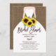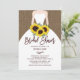Enkel elegans inbjudningskort för möhippan med en contemporary brud som rymmer en bukett av solblommor av fallande gult, med en chic med handsbokstäver och som sätts på en brun baksida.