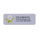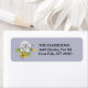 På den lämnat sidan av dessa returetiketter finns en vattenfärgsbild av en liten vit bichon Frise-hund bland spridda solblommor och eukalyptus löv. Din anpassningsbar är svart på högerna och allt placeras på en medelblå grått-blå bakgrund.