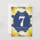 Denna dubbelsidiga marinblå och gula nummerskylt för bröllopsbord har snygga gula solrosor på en vintagebakgrund. De är perfekta för trädgårdsfester, bröllop i ladan och bröllopsteman med solrosor. Varje nummerskylt måste anpassas och läggas till i din varukorg. Nummerskyltarna är dubbelsidiga med utrymme för brudens och brudgummens namn. Se till att ändra texten på båda sidor. Designad av Victoria på VG Invites. För att se mer av Victorias dekorationer för bröllop med solrosor besök www.zazzle.com/vginvites