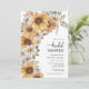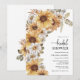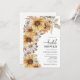 Solrosbröllopsfestinladning. Tillsätt en nyp av solsken till din bröllopsfest med dessa vackra, handmålade akvarellgula solrosor, vita prästkragar och salvia gröna och terrakottafärgade blad. Perfekta för en romantisk rustik höst eller en utomhus sommarträdgårdsfest, dessa fantastiska boho-chica bröllopsfestinbjudningar sätter tonen för din speciella dag. Hitta kompletterande produkter i Rustika akvarellsolrosbröllopsinbjudningar.