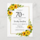 Vacker gul solrosblomma 70-års födelsedagsinbjudan. Gula peonior och vita prästkragar blandar sig med solrosorna. En rektangulär guldram ger den en elegant känsla. Mycket lätt att anpassa. Baksidan har en solrosbukett. Detta är perfekt för en sommarfödelsedagsfirande. Denna artikel är en del av kollektionen Yellow Sunflower White Daisy.