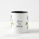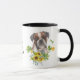 "KÄRLEK MY BOXER" förklarar detta mugg för den stolta Boxer hundägare. På båda sidor om mugg finns en vacker vattenfärg porträtt av en brun och vit hund Boxer som är inramad av solrossolens blommar och gröntens löv. Blandat i är sprit av blått grönt eukalyptus. Mellan två bilder finns texten som du enkelt kan anpassa eller till och med ta bort.