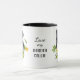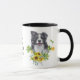 "KÄRLEK MY GRÄNS COLLIE" förklarar detta mugg för den stolta ägaren av Gräns Collie. På vardera sidan om mugg finns en vacker vattenfärg porträtt av en svart och vit kollie inramad av blommar och löv av grönt. Blandat i är sprit av blått grönt eukalyptus. Mellan två bilder finns texten som du enkelt kan anpassa eller till och med ta bort.