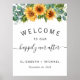 Rustikt bröllopsmottagande eller välkomstskylt för förlovningsfest med akvarellbuketter av solrosblommor och eukalyptusgrönska. "Happily Ever After" är skrivet i en blandning av enkel typografi och ett trendigt manus med svängar. Lägg till dina förnamn och datum.