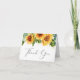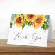 Rustik bröllopsdusch vikt tackkort. Framsidan har akvarellbuketter med solrosblommor och eukalyptusgrönska och "Tack" i ett stilrent kalligrafiskript. På insidan kan du anpassa ditt tackmeddelande och lägga till ditt namn i ett signaturliknande skript, eller lämna det tomt för en handskriven anteckning.