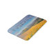 Den här unika badmattan har ett utdrag från en ursprunglig oljemålning av konstnären Leah Wiedemer som heter "Följ Sol". Solblommor i gult tar upp dig i förgrunden, vilket gör att öga hamnar i ljuset på ett lantbruk i Toskana och rullar jordbruksmark i mitten av marken. Blåberg finns i avstånd under ett dramatiskt himlar. Det dominerande färgen är gult och blått.