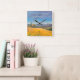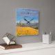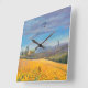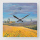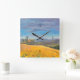 Den här moderna väggklockan har en originaltext med oljemålningen "Följ Sol" av konstnären Leah Wiedemer. Bilden är av en ljus gult fält av solblommor, med ett nederländskt jordbrukshus. Rullande backe är subtila skuggor av blått och violett och grönt, som leder till avlägsna berg.
