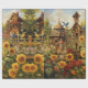 En trädgård med många fågelhus och gult solblommor.