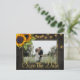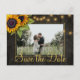 Gula orange solrosor och strängar av gnistrande ljus på mörkbrun elegant lada trä foto spara datum bröllop postkort. +++++++++ Lätt att anpassa med dina namn och text! ++++++++++ Lämpar sig för blomster sommar eller höst / trädgård bakgård rustika land eller bondgård bröllop.