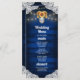 Solros Masonburk Trähölje Bröllopsmeny Kort - har en blå lada trä bakgrund kantad med spets och dekorerad med varmt färgad sträng gnistrande ljus. Designen har också en bukett solrosor inuti en masonburk som du kan anpassa initialerna till de av ditt val. Baksidan har samma lantliga rustika bakgrund för att matcha framsidan.