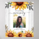 Perfekt för vår- och sommarfester. Solrosillustrationen ritades och målades för hand med akvarellfärger. Bakgrundsbladen ritades för hand och färglades digitalt. Söt och lite rustik solrosdesign. Lättanvänd mall. Illustration av Valarie Wade. All text är justerbar. In loving Memory (till minne av)