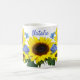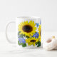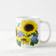 Vackra solblommor med små blå fjärilar och blåa vattenblåsor, så glada och upplyftande att de gör en mugg som kommer att göra den mörkaste dagen ljusare!