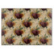 Ett mycket detaljerat mönster av guldblommor, bruna ranunculus, grönt fern fronds, fegis grenar ovanpå en monokrom dammaskisk bakgrund