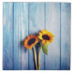 Ett vackert foto av ett par briljanta solrosor av gult guld på en rik åldras blå trävägg.