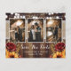 Dessa rustika blombröllop sparar datumet foto postkort med burlap, spets och lada träbakgrund är idealiska för en rustik bröllopsfest inspirerad av solrosor och röda rosor.