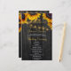 Elegant rustic budget bröllopsceremoni program mall med vackra ljusa gula orange solros buketter och strängar av gnistrande ljus på en landsbygd stil mörkbrun trä bakgrund. +++++++++++ + Anpassa det med dina dina detaljer.+++++++++++ Lämplig för rustic country vintage chic sommar trädgård | höst höst utomhus bröllop.