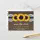 Solros Rustik Blå Jute Spara Datum-kort - har en bakgrund av lada trä med solrosor, spets, jute och ett tryckt marinblått band. Se hela den matchande kollektionen på denna sida.