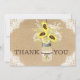Solrosbukett i Mason burk och vit snöre på den pappra bakgrunden, modern strålande blommigt tack vare ditt kort.