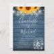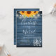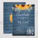 En stilren rustik bröllopsinbjudan med vackra solrosor, strängljus, murbrukskärl, signaturstilnamn och chic typografi på en blå rustik trädgårdshackgrund. Baksidan visar dina initialer i form av ett monogram inom en matchande solros. Designad av Thisisnotme