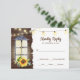 Rustic Bröllop OSA Card visar en blommigt gult solros och grönenergi med strängen ljus och en lantern på mörk trä med skal kant bakgrund. Osan har val av måltider och kan anpassas till valfri information. Perfekt för sommar- och hösthösten bröllop.~
