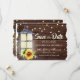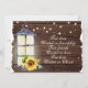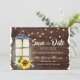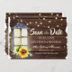 Rustic Bröllop spara datum skildrar en blommigt gult solros och grönt med strängen ljus och en lantern på ett mörk trä med bakgrund av skalopad kant. Baksidan av det kristna inspirationstecknet "Två liv förenade i vänskap, Två vänner förenade i kärlek, Ett kärlek förenade i Kristus". Perfekt för sommar- och hösthösten bröllop*.