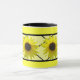Soliga solrosor mot en svart korsad bakgrund och svartbrämar. En livlig kaffemugg som hjälper dig, startar din dag. Inkludera denna mugg med att matcha brevpapper, kuvert och stämpla också tillgängligt för en riktigt färdig brevpappergåvauppsättning för en speciell gåva.