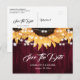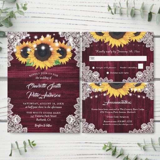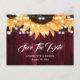 Rustika burgunder- och solrosbröllop spara datum-kort med solrosor och strängljus på en rustik trädgård bakgrund. Matchande artiklar tillgängliga.