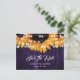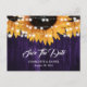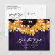 Rustika inbjudningskort med lila solrosbröllop med solrosor och strängljus på en rustik trädgalleri. Matchande föremål finns.