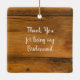 Visa er uppskattning och tacksamhet till era brudens sida och bröllop med charmeringen och eleganten Solros och Veil-Landsbyggsbröllopet Bridesmaid Tack Square Ornament. Den här anpassningsbarnas avslappnade och strålande prydnadsföremål har en fyrfärgad blommigt av en solrosliknande blommar i gult och vit möhippa med en brunfärgad bakgrund av barrträ i ladugården.