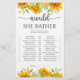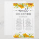 Solros “Skulle hon hellre” bröllopsduschspel. Designen har en bukett med akvarell vita rosor och gula solrosor. Se länken till samlingen på denna sida för att se alla matchande föremål i denna vackra design.