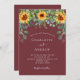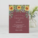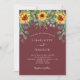En vinröd, vinröd färgad bakgrund dekorerad med solrosor och eukalyptusgrönska. Anpassa och lägg till era namn och festdetaljer.