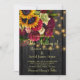 Modell för inbjudan till Rustic landsbyggsbröllop firande och mottagningsinbjudan på mörk, brunladuvirbakgrund med stora solblommor i gult guld och röda burgundy ro bouquets, strängar av twinkle ljus, och ett typografiskt skript för faux snyggt guld. +++++++++++++++ Enkel att anpassa med dina uppgifter! Du kan välja att anpassa det ytterligare genom att ändra typsnitt och färg på text. (++++++++++++++) Inbjudan är lämplig för landsbyggsbröllop för höstfallande utomhusträdgård/vintage vid trädgårdsodling.
