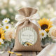 Denna solros-dekal för bröllopsgåvor är ett charmigt och elegant sätt att lägga till en personlig finish till din speciella dag. Med en mjuk arrangemang av gyllene solrosor, elfenbensfärgade blommor och grönska längs botten, i kombination med en varm krämfärgad bakgrund och en rand med salviafärgade ränder runt en cirkel, kompletterar den perfekt rustika, trädgårdsinspirerade och landsbygdsinspirerade bröllopsteman.