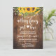 Bröllopsinbjudan för elopementfest med rustik träsockel, fairy lights och solrosor. Gör det till ditt eget genom att lägga till din text (och personliga foton). För att få tillgång till avancerade redigeringsverktyg, gå till “Personifiera”, scrolla ned och tryck på länken "klicka för att anpassa ytterligare". För fler matchande designs, klicka på länken “Andra produkter från denna samling”.