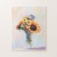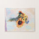 Min originalkonst pryder detta vackra blomsterpussel, bestående av mitt ursprungliga fotografi av kristallvas med solrosor och andra blommor. Jag har stylet mitt foto med en illustrerad akvarellstil för en konstnärlig touch. Storleken på detta unika naturpussel är 28 cm x 35,5 cm, och det hamnar i kategorin "utmanande", men man kan välja större eller mindre storlek om man önskar. En fin present till en blomsterälskare eller naturälskare. Även bra för en pusselfanatiker eller vilken pusselälskare som helst.