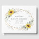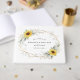Konstruktionen har vattenfärgsmörjmedel, solblommor, tryckt guld inslag och botaniskt löv över ett tryckt guld färgad geometriskt ram. Baksidan har en passande grön och solrosliten bukett.