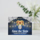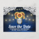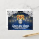 Solrosemurbrukad trä salva datum vykort - Solrosemurbrukad trä spets bröllop inbjudan - har en marinblå eller blå ladutrustning bakgrund kantad med spets och dekorerad med varmt färgade strängljus. Designen har också en bukett solrosor inuti en murbruka som du kan anpassa initialerna till de av ditt val.