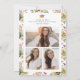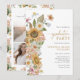 Solros Examensinbjudan. Fira din milstolpe med stil med denna fantastiska examensfestinbjudan, med en fantastisk handmålad sidobukett av rosa och dammiga blå vilda blommor med rustika gula solrosor. Den eleganta guldsriften lägger till en förfinad touch som på ett vackert sätt kompletterar det blomsterrika mönstret. På baksidan låter en 3-fotokollage dig visa dina favoritminnen, inframmade av ett koordinerande akvarellmönster för en sammanhängande och polerad look. Sätt den perfekta tonen för din gymnasie- eller högskoleexamen - skapa ett minne som är lika unikt som din resa!