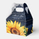 Lägg dina möhippa-/bröllopsgåvor i den här eleganten och romantiska marinblå och solrosliknande bröllopsboxar med solblommor, ljus och vitt på en rustik träbakgrund.