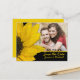 Svart och gult solrosfoto bröllop spara datum vykort. Fetstig solrosa med stor gult parad med förlovningens foto och svart bakgrund. Ytterligare formuleringar på baksidan också.