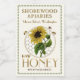 En söt liten 2 x 3-tums honungsetikett med realistiska bin och solrosor. HONEY trycks i en metallisk guld-gradient. Streckad gräns i grönt ger en gammaldags beröring.