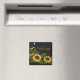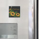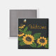 Solrosmagnet är en av mina akrylmålningar med texten välkommen. Det är kallt att ta emot gäster i kylen.
