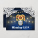 Solros Mason Burk Blue Wood Bröllop OSA Cards - har en royal marin eller blå ladugårdsbakgrund som trimmas med snöre och som dekoreras med varm färgad av tinkle ljus. Utformningen har också en bukett med solblommor inuti en mason burk som du kan anpassa initialer till de alternativ du väljer. Baksidan har också samma land-bakgrund som framsidan.
