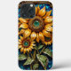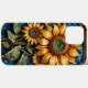 Färgglast glasmosaik med solrosor och livfulla blad samt en texturerad bakgrund i en dekorativ ram.