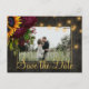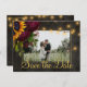 Gula gyllene solrosor, vinröda rosor och strängar av glimmljus på mörkbrun elegant lada trä foto spara datum bröllop vykort. +++++++++ Lätt att anpassa med era namn och text! ++++++++++ Lämplig för blomster sommar eller höst / trädgård bakgård rustika land eller bondgård temade bröllop.