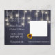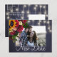 Gula solrosor i gult guld, röda burgunderrosor, strängar av gnistrande ljus och vit typsnittskrift på mörk midnattsblå elegant svart tavla foto nytt datum uppskjutet bröllop annons kort. +++++++++ Lätt att anpassa med dina namn och text! ++++++++++ Lämplig för blomster vintern, jul, sensommar eller höst / trädgård bakgård rustika land eller bondgård bröllop.