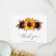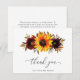 Solrosblommig Bröllopsfest Tackkort med en rustik bukett med akvarellmålade solrosor, röda rosor, lila blommor och grönska. Nedan syns ditt namn och på baksidan finns ditt personliga tackmeddelande. Detta eleganta platta tackkort är perfekt för en boho-tematisk bröllopsfest på hösten.