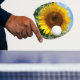 Slut upp av en solros som tas mot en bakgrund av ett fält av solrosor